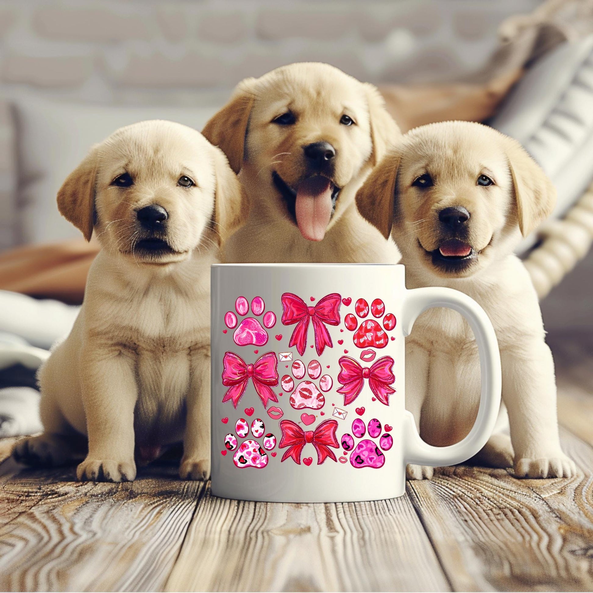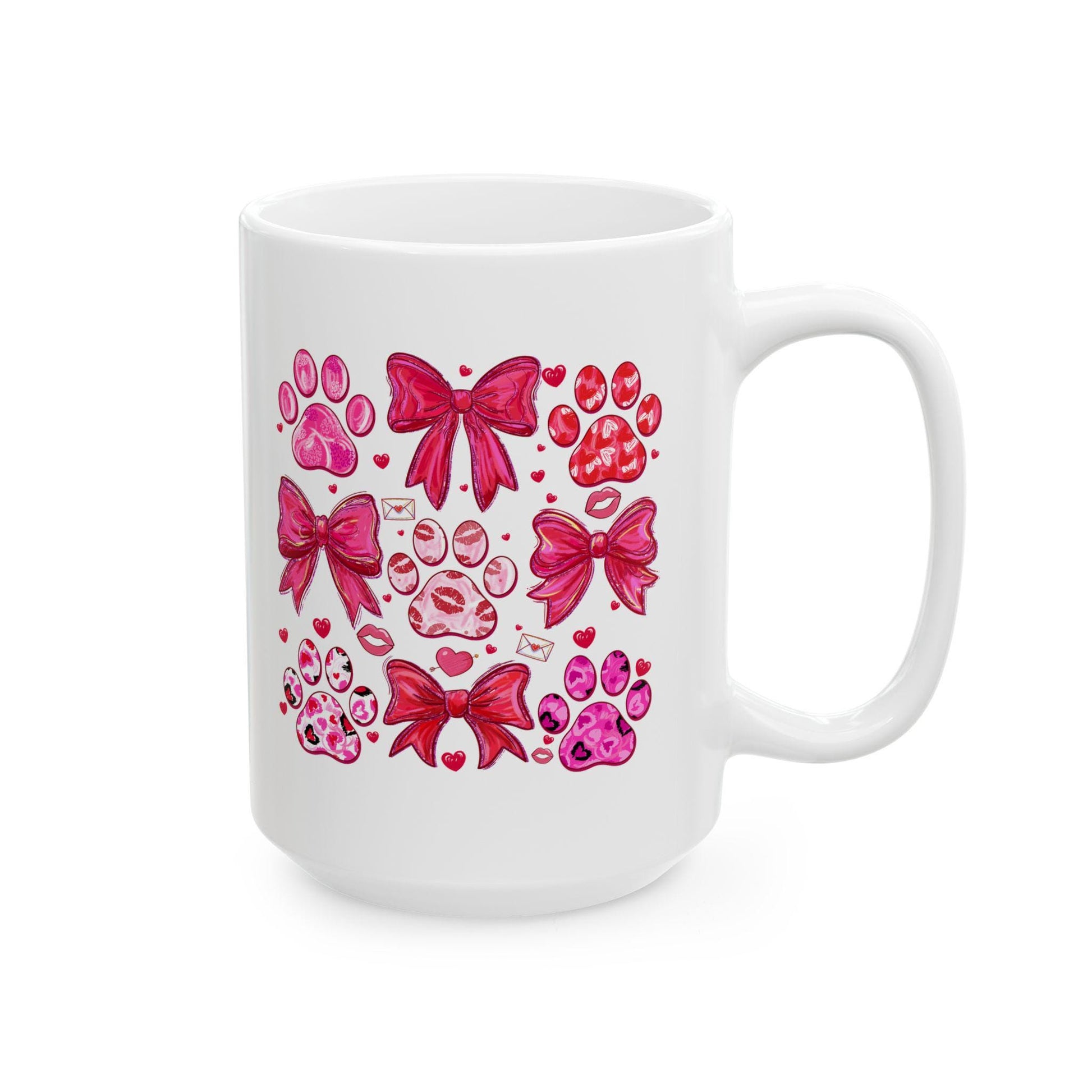 Warm and playful, this glossy ceramic mug carries a streak of joy with watercolor-style paw prints and a hand-painted pink bow. Each sip becomes a small moment of comfort — whether you're easing into the morning, taking a breather between walks, or sharing tea with a fellow animal lover. The bright, vibrant print wraps the white surface so the artwork pops; the C-handle feels familiar and steady in your hand. Bring this mug out on cozy mornings, shelter adoption days, or when you want to celebrate a loved one who adores furry friends. Product features - Glossy white ceramic with vibrant, long-lasting print - Available in two sizes: 11oz and 15oz - Microwave-safe for reheating drinks - Dishwasher-safe for easy cleaning - Lead- and BPA-free with a comfortable C-handle Care instructions - Clean in dishwasher or wash by hand with warm water and dish soap