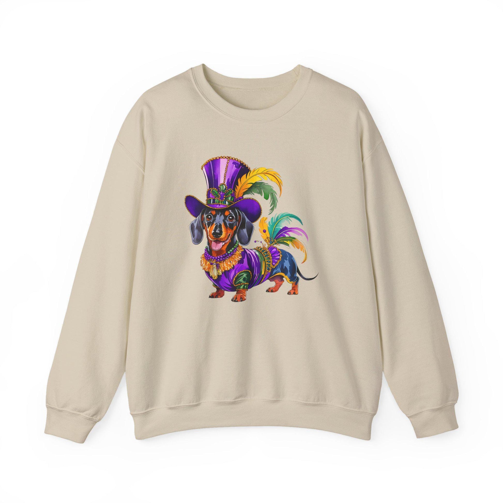 Slide into comfort with this cozy dachshund crewneck that carries a playful Mardi Gras spirit. The lightweight-yet-substantial cotton-poly blend feels warm against the skin while staying breathable for all-day wear, making it ideal for canine festival wear and fun Mardi Gras gear. At the center is a colorful, finely detailed top hat dachshund illustration, dressed in a feathered parade costume top for a true carnival dog shirt vibe. This whimsical pet top turns a simple sweatshirt into a fantastic animal parade shirt and a funny dog sweatshirt—perfect for relaxed nights, festive streets, or pet-themed outings with your dog loving friend.