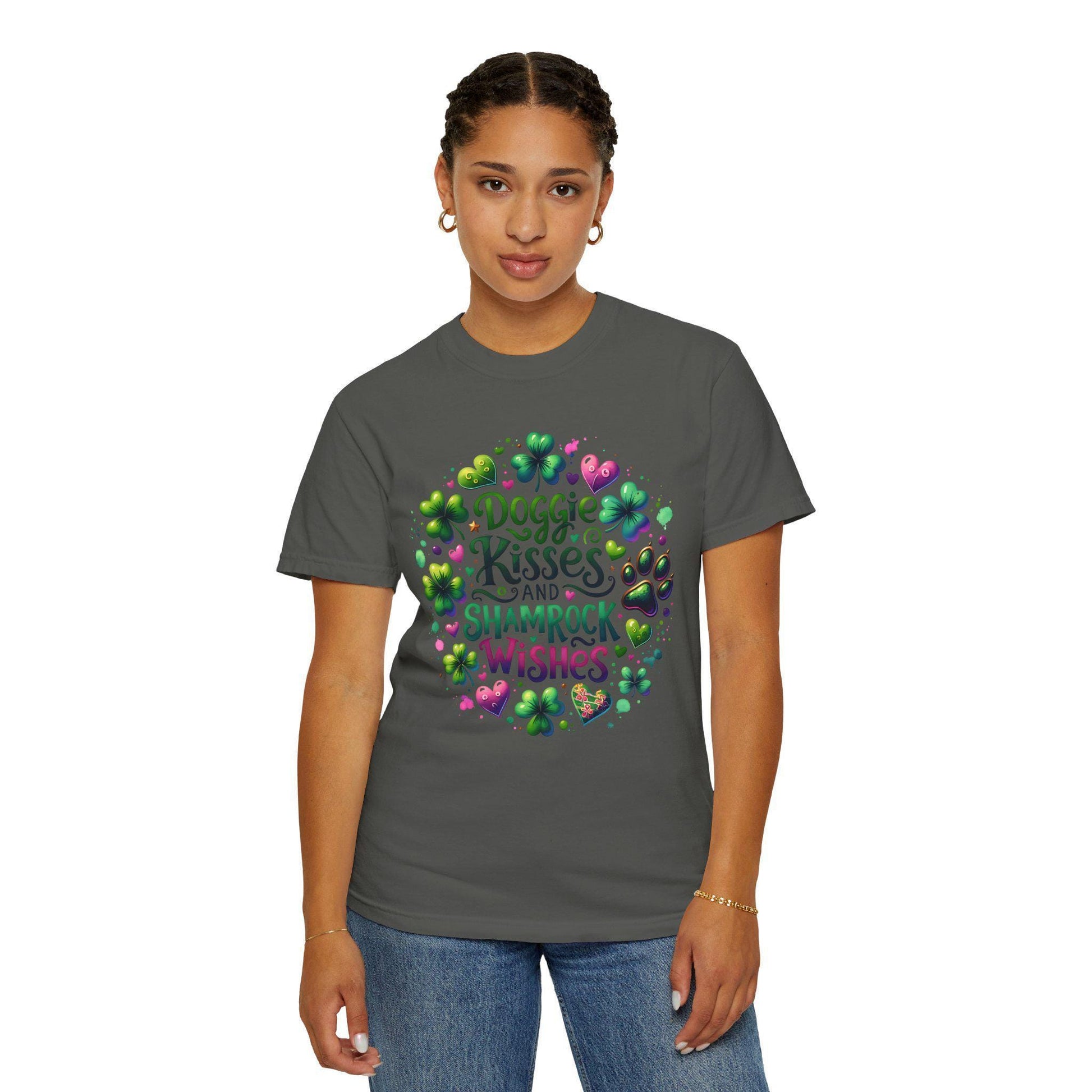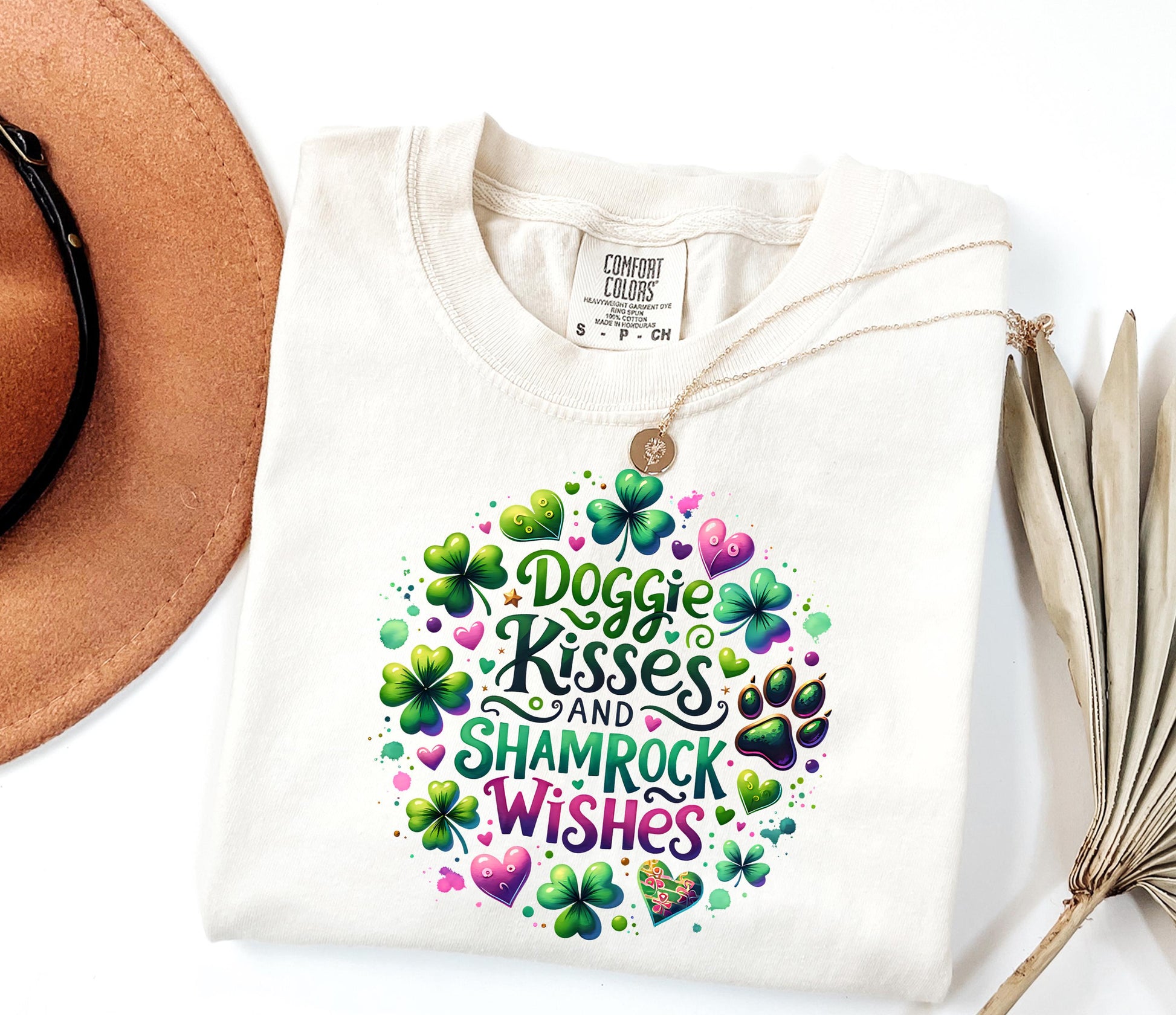 Soft, lived-in feel shirt with a playful St. Patrick’s Day motif made for every dog mom st pat shirt lover. The garment-dyed finish gives the cotton a cozy, broken-in touch, perfect for soaking up those doggie kisses tee moments. The front says “Doggie Kisses and Shamrock Wishes,” framed by watercolor-style shamrocks, st pats paw print clover, and sweet hearts—playful without being loud.