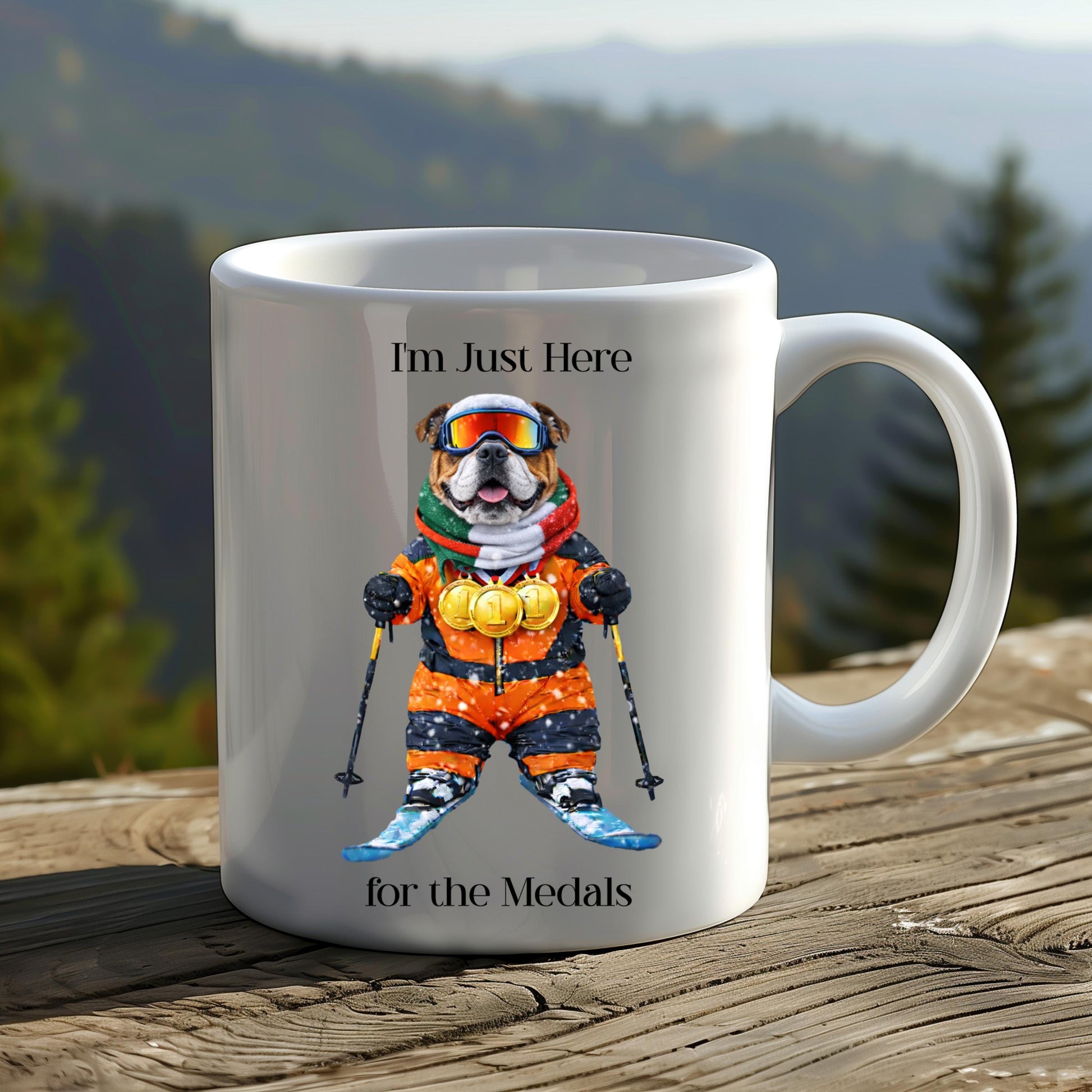 I'm Just Here for the Medals Skiing Bulldog Mug | Apres Ski Gift