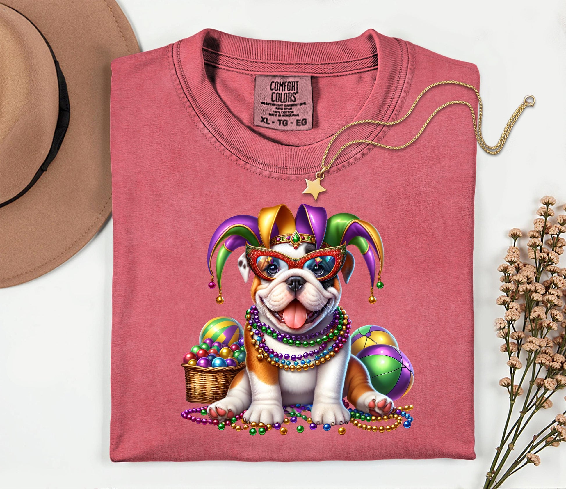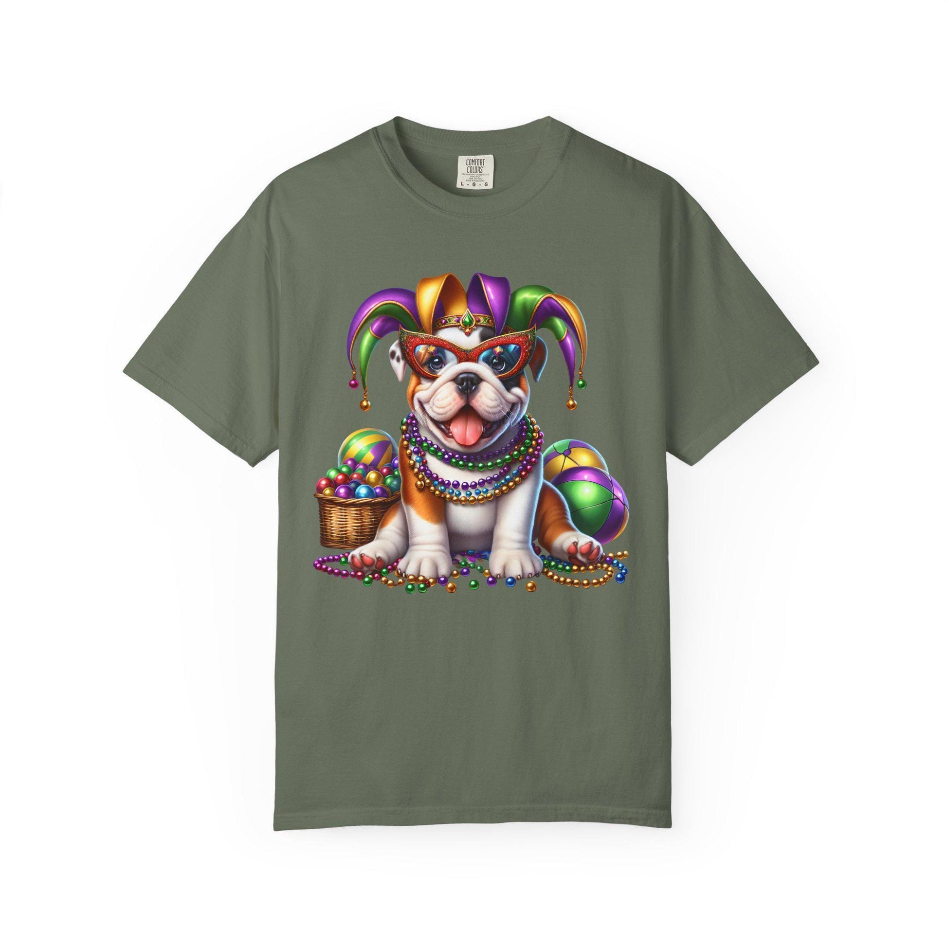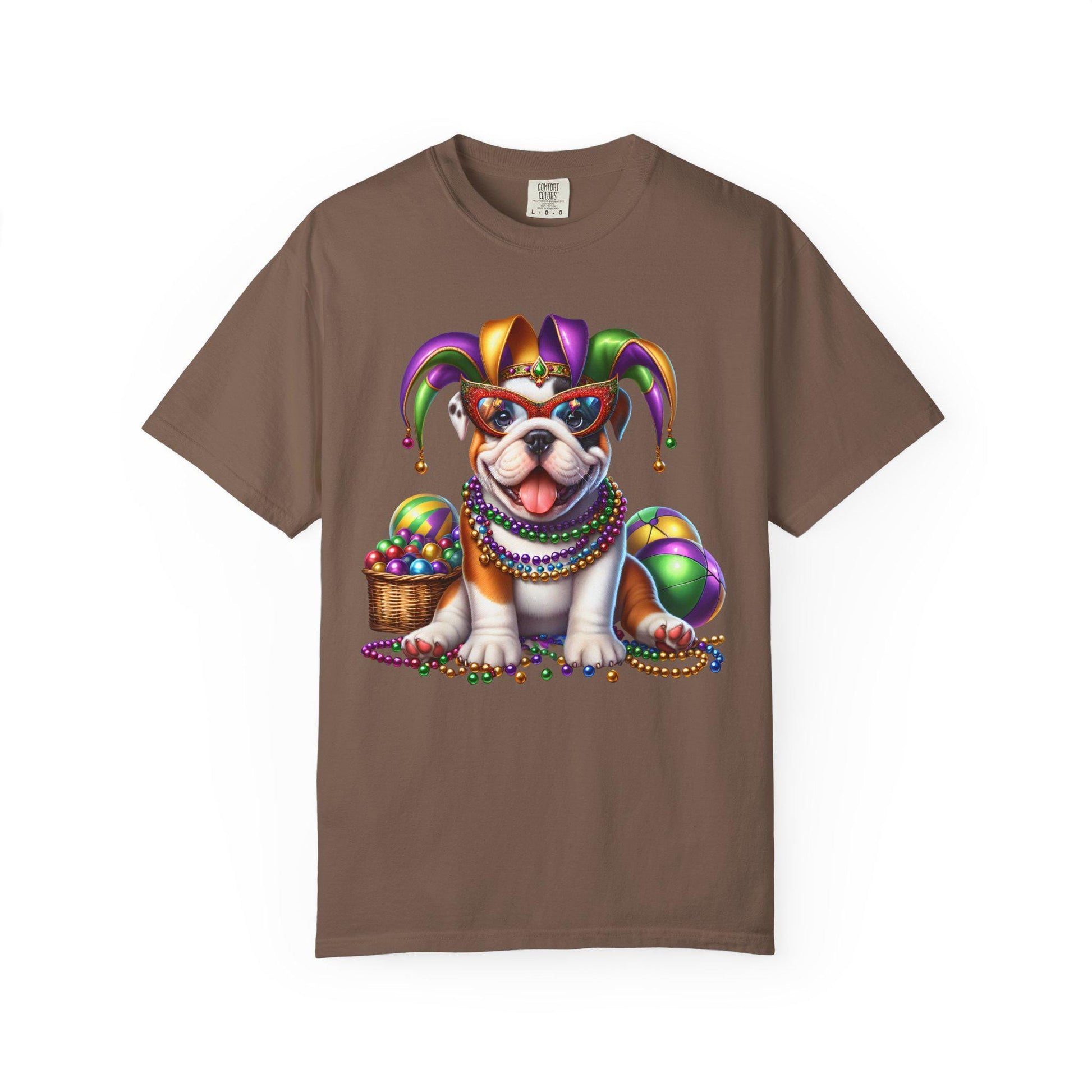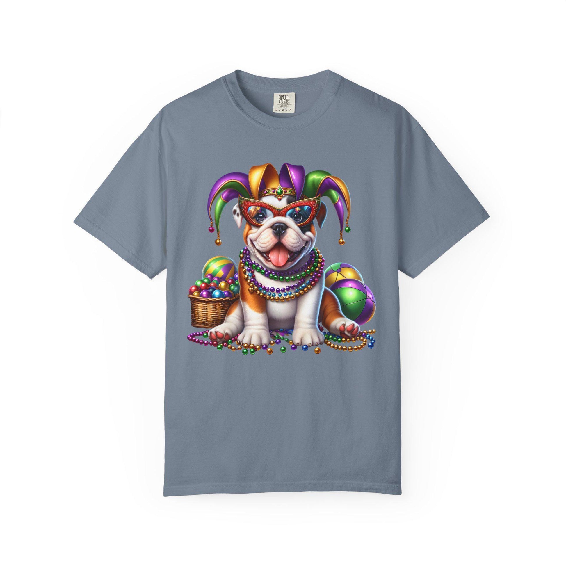 This relaxed, heavyweight mardi gras shirt brings festive pet tee vibes to your everyday style. A playful bulldog t shirt design shows off a cute dog graphic wearing a jester hat, beads and masks—bold purples, greens, and golds stand out against a soft, garment-dyed unisex casual tee. The thick cotton feels comforting from the start with a slightly vintage wash and strong double-needle seams to last through every celebration, making it just right as your party costume tee or carnival parade tee.